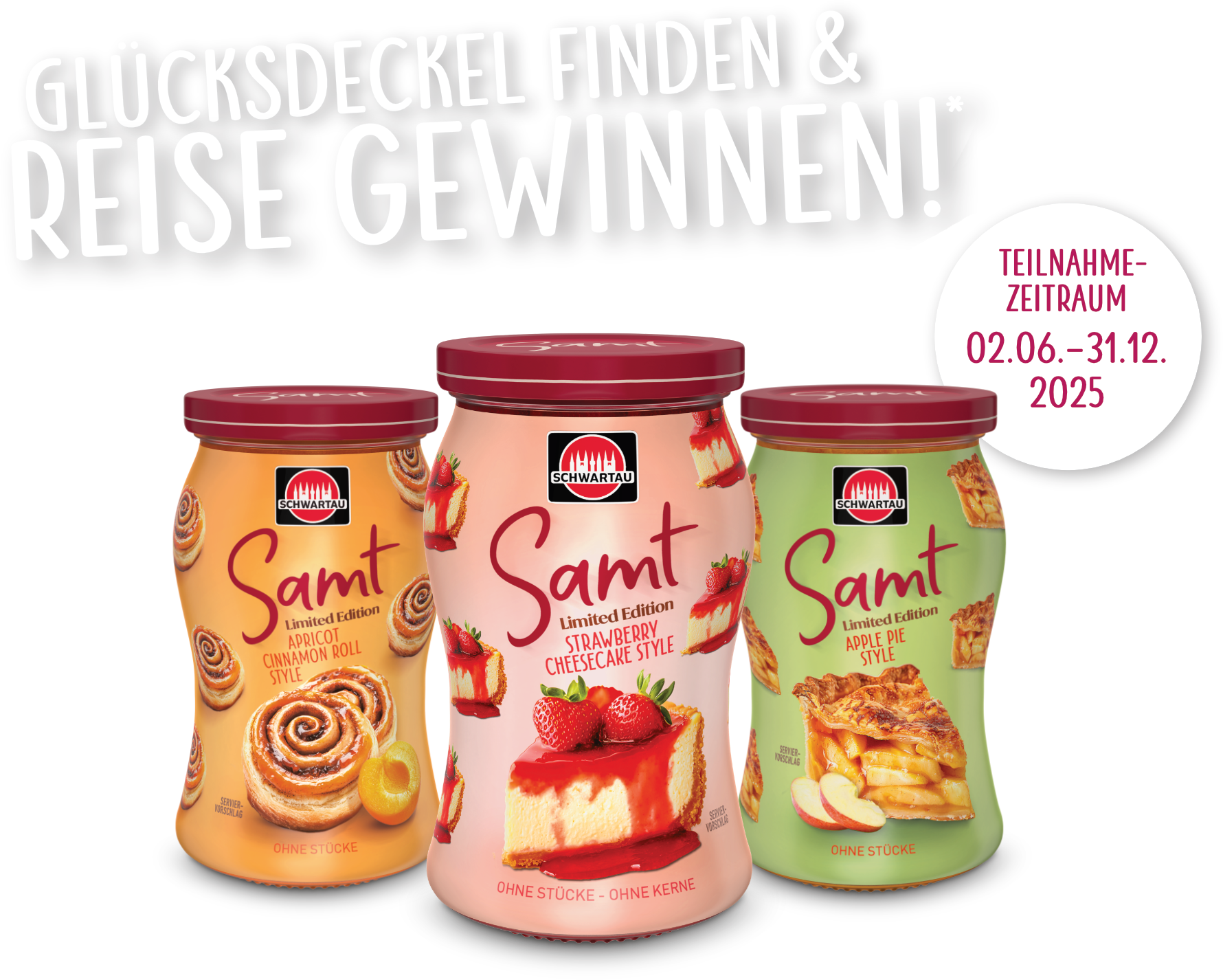 2.1. An der SAMT GLÜCKSDECKEL Aktion können alle geschäftsfähigen natürlichen Personen ab 18 Jahren mit Wohnsitz in Deutschland teilnehmen, die im Teilnahmezeitraum vom 02.06. bis zum 31.12.2025 ein Glas Schwartau Samt Limited Edition Strawberry Cheesecake Style, Schwartau Samt Limited Edition Apricot Cinnamon Roll Style oder Schwartau Samt Limited Edition Apple Pie Style (im Weiteren: Aktionsprodukt) kaufen, einen Glücksdeckel finden und nach den im Folgenden beschriebenen Bedingungen an der SAMT GLÜCKSDECKEL Aktion teilnehmen. Die Aktionsprodukte sind ab dem 02.06. im Handel erhältlich - hierbei gilt: nur solange der Vorrat reicht.